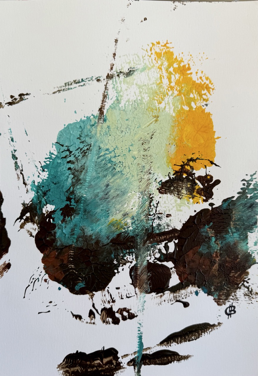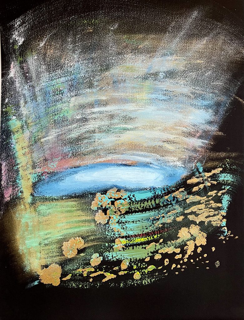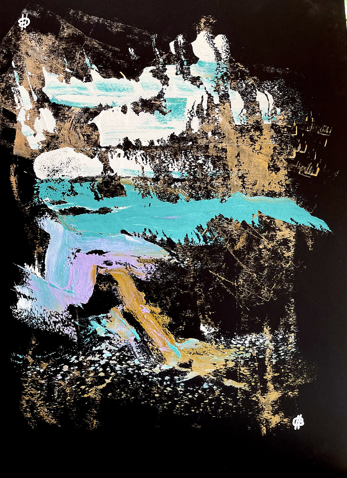 Certaines oeuvres sont réalisées en techniques mixtes avec de l’acrylique et de la poudre de marbre. Incorporer de la poudre de marbre permet d’obtenir des effets visuels qui modifient la perception. Textures, impasto, reliefs presque sculpturaux ; et la surface granulaire diffuse la lumière sur la surface peinte, qui devient comme veloutée.