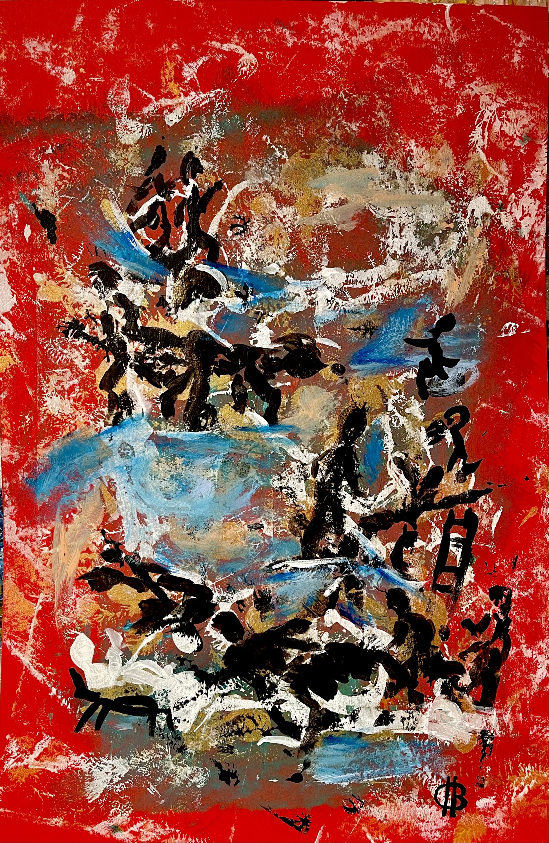 Papiers de 200 à 400 g/m2 comme l’Olympe Perlé extra blanc, le Fabriano Black Black, le rouge vif. Les pinceaux, fabriqués à l’atelier, permettent un travail gestuel, intuitif et zen… C’est ainsi que sont créées les oeuvres présentées ici.