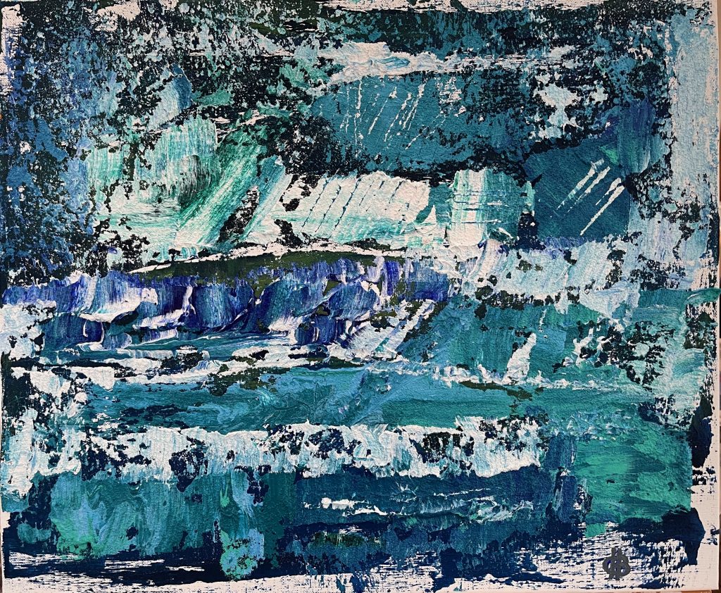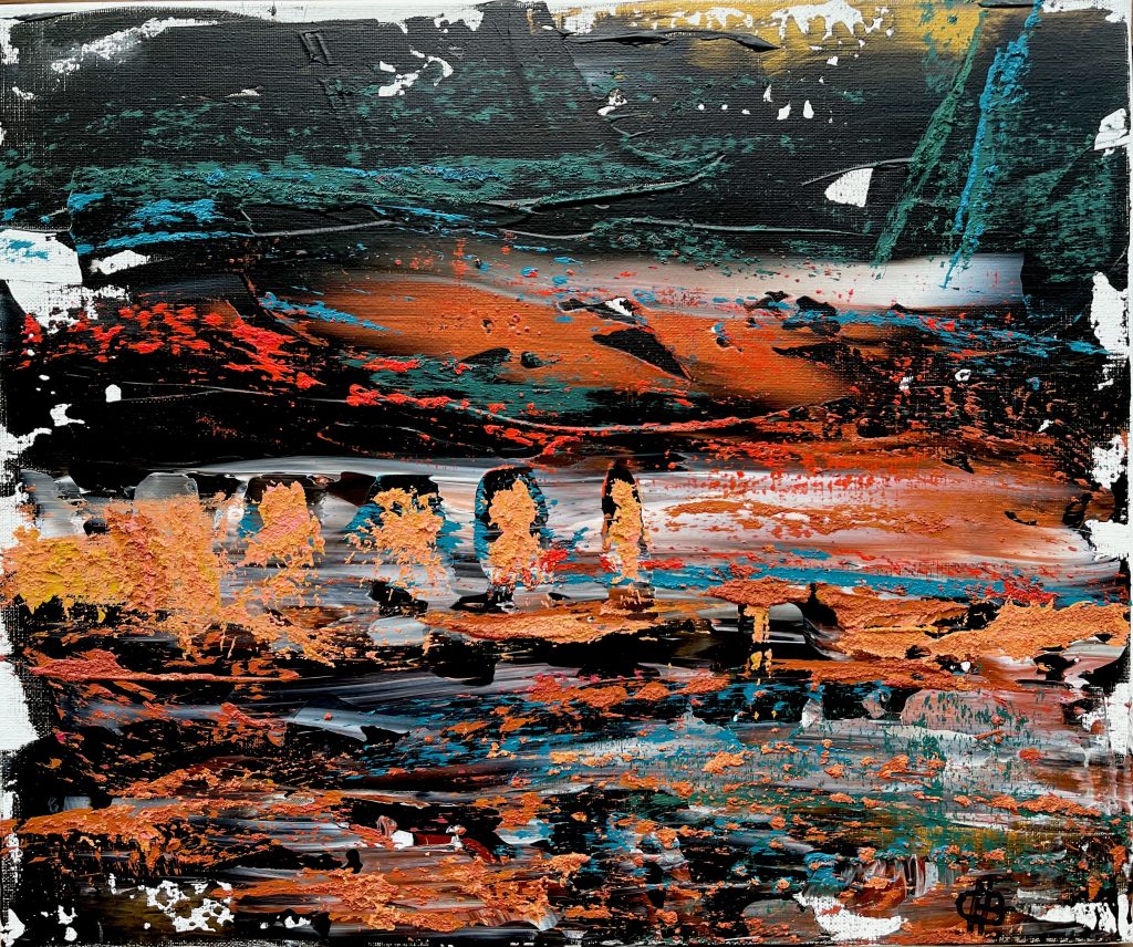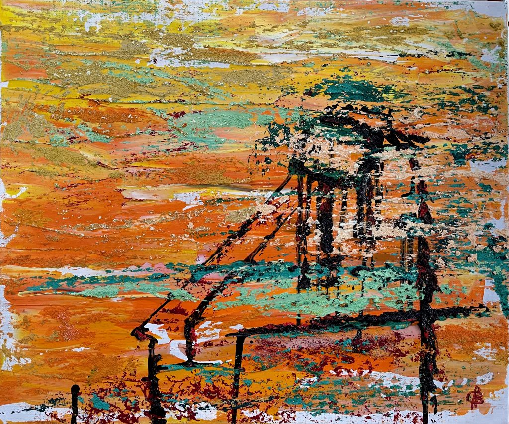Les toiles sont en lin, de fabrication française. Les panneaux de bois permettent de travailler la matière différemment. Beaucoup d’oeuvres sont réalisées en techniques mixtes avec de l’acrylique incorporant de la poudre de marbre. Incorporer de la poudre de marbre permet d’obtenir des effets visuels qui modifient la perception. Textures, impasto, reliefs presque sculpturaux ; et la surface granulaire diffuse la lumière sur la surface peinte, qui devient comme veloutée.